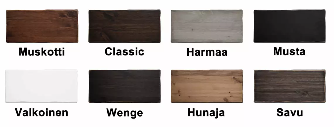 Massiivipuisiin Loimu-kalusteisiin on valittavana useita kauniita värejä. Suunnittele oma persoonallinen kokonaisuus ja valitse useista puuvärivaihtoehdoista mieleisesi puuvärisävyt kalusteiden eri osiin. Esimerkiksi kansi tai jalkaosa voi olla eri värinen, kuin kalusteen pääväri. Päästä luovuutesi valloilleen ja kokeile rohkeasti!
