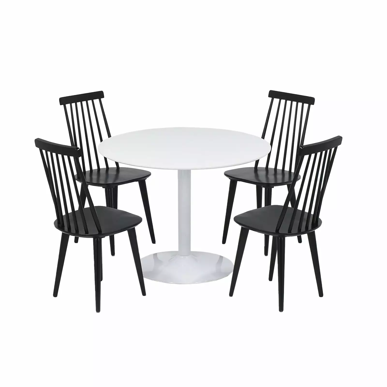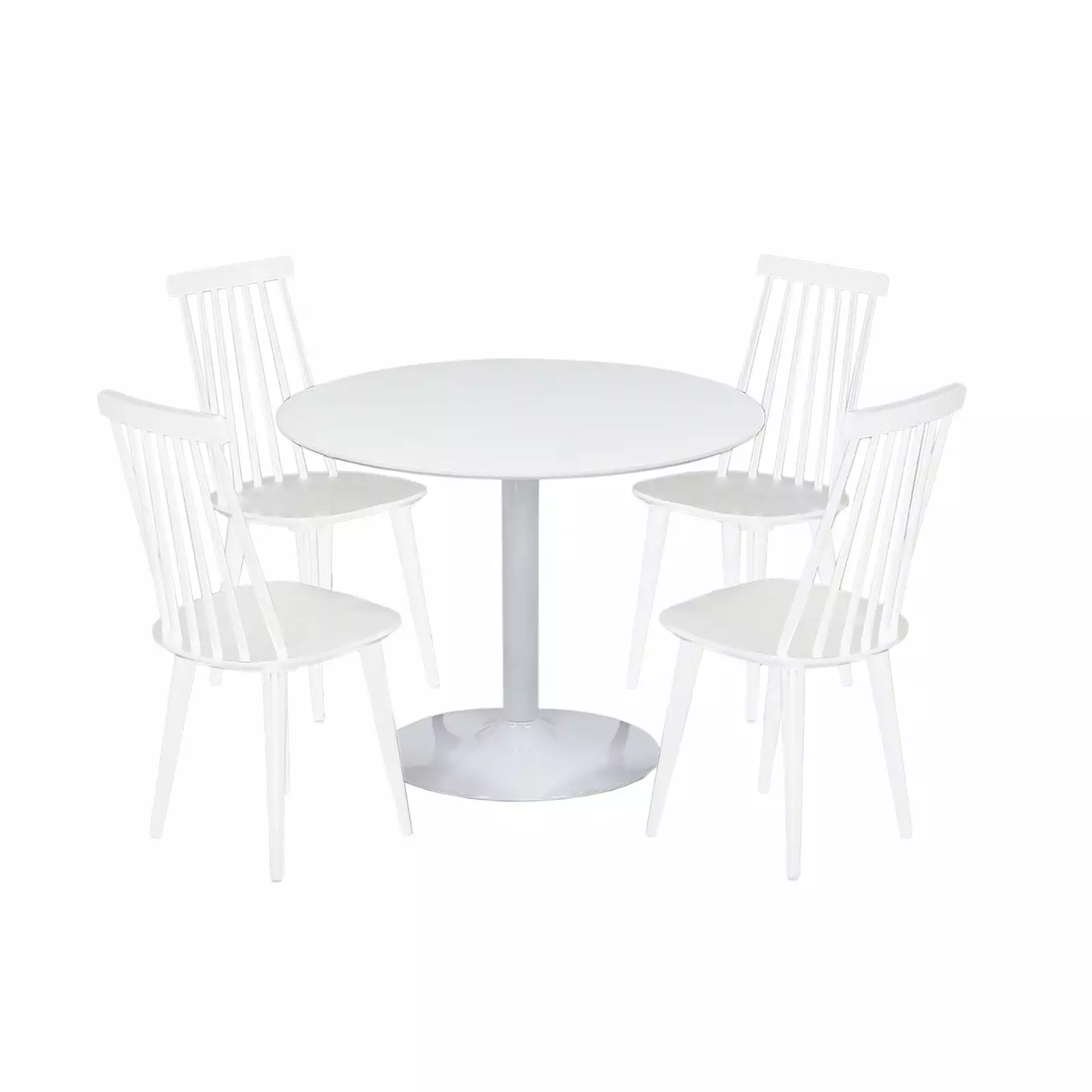 Laadukkaan City-pöydän kansi on maalattua mdf-huonekalulevyä ja pöydässä on metallinen trumpettijalka, joka antaa hyvin vakautta. Veeti-pinnatuolin materiaali on maalattua kumipuuta. Pyöreän City-ruokapöydän kannen halkaisija on 100 cm ja sen ääreen mahtuu hyvin 4 ruokapöydän tuolia. Valkoinen pöydän väri ja pelkistetty muoto luovat hillityn tyylikkään vaikutelman ruokaryhmälle – valinnan mukaan valkoisten tai mustien tuolien kanssa.