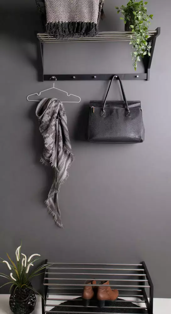Oikeanlainen hattuhylly ja naulakko ovat avainasemassa siinä, että eteinen pysyy siistinä. Naulakollisessa Padova-hattuhyllyssä kauden takit ja tärkeimmät asusteet pysyvät nätisti järjestyksessä ja nopeasti käyttövalmiina. Hyllyn runko on mustaksi maalattua puuta, ja naulakot sekä hyllytaso ovat metalliset.