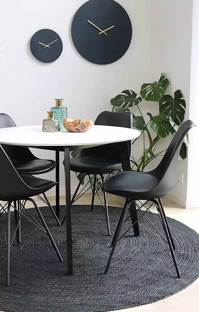 Pyöreä Rimini/Milano -ruokailuryhmä tuo ruokailutilan sisustukseesi keveyttä ja ilmavuutta. Sirossa Rimini-ruokapöydässä on ohut kansilevy ja vinot jalat, jotka tuovat muotoiluun nostalgisia vaikutteita ja menneiden aikojen tunnelmaa. Kokonaisuuden kruunaavat Milano-kuppituolit, joiden näyttävä jalkaosan koristelu kääntää katseet. Pöydän ääreen mahtuu ruokailemaan neljä henkilöä.