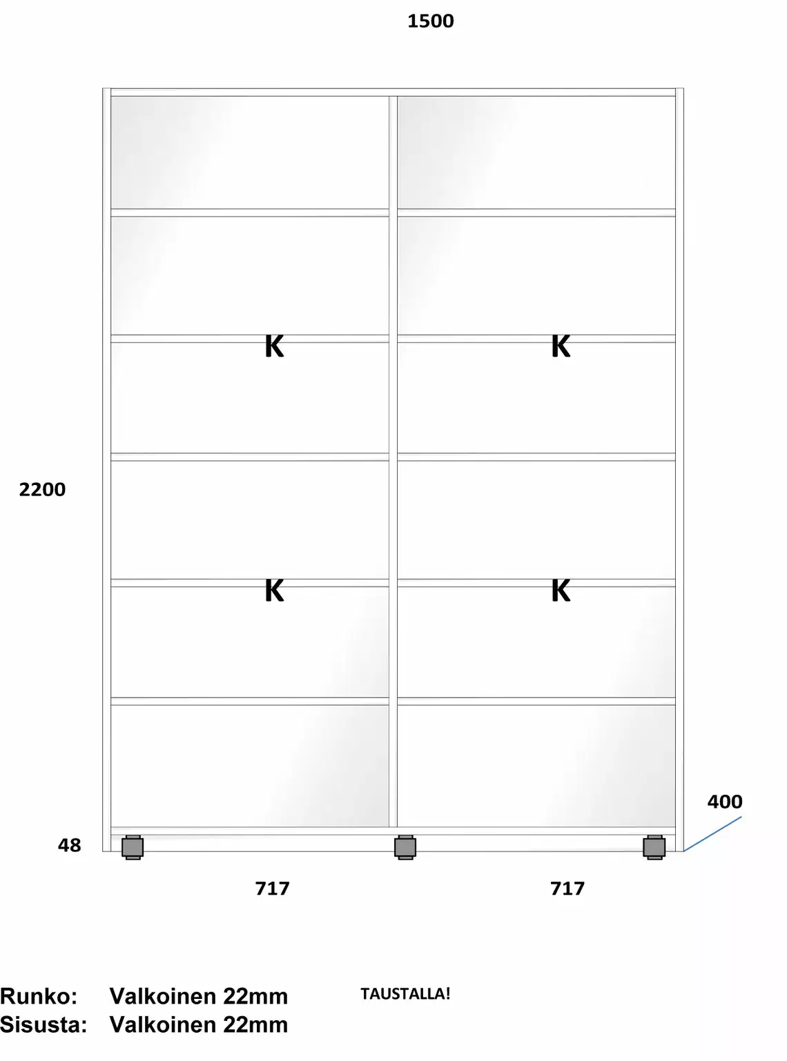 Kuvissa on yksi mahdollinen esimerkkikokoonpano Lakeus Design -liukuovikomerosta. Esimerkkikaapissa on tuotekuvissa esitellyt materiaalit sekä sisustan tarvikkeet. Erilaiset materiaalivalinnat ja sisustaan valitut varusteet vaikuttavat komeron hintaan.