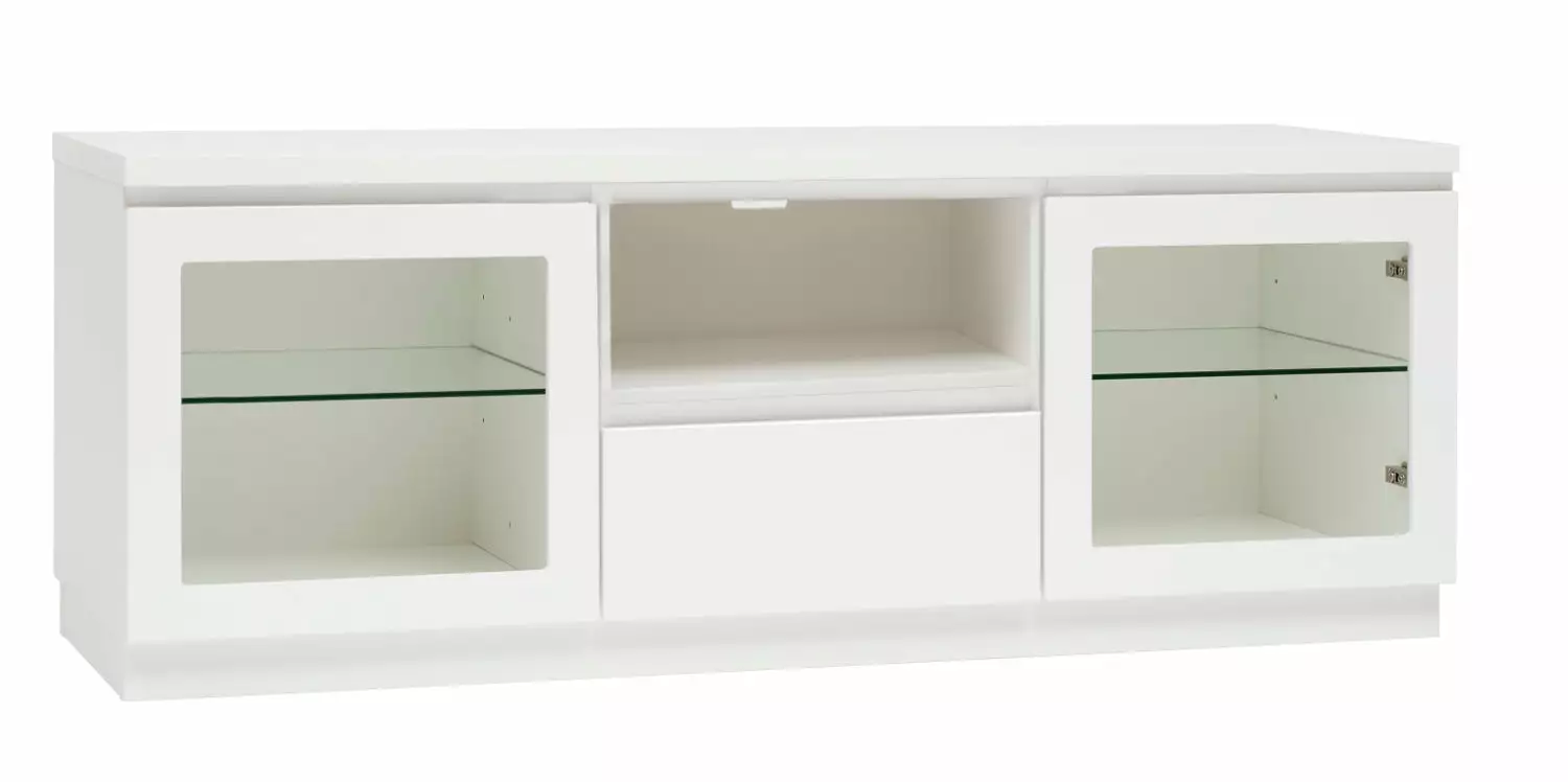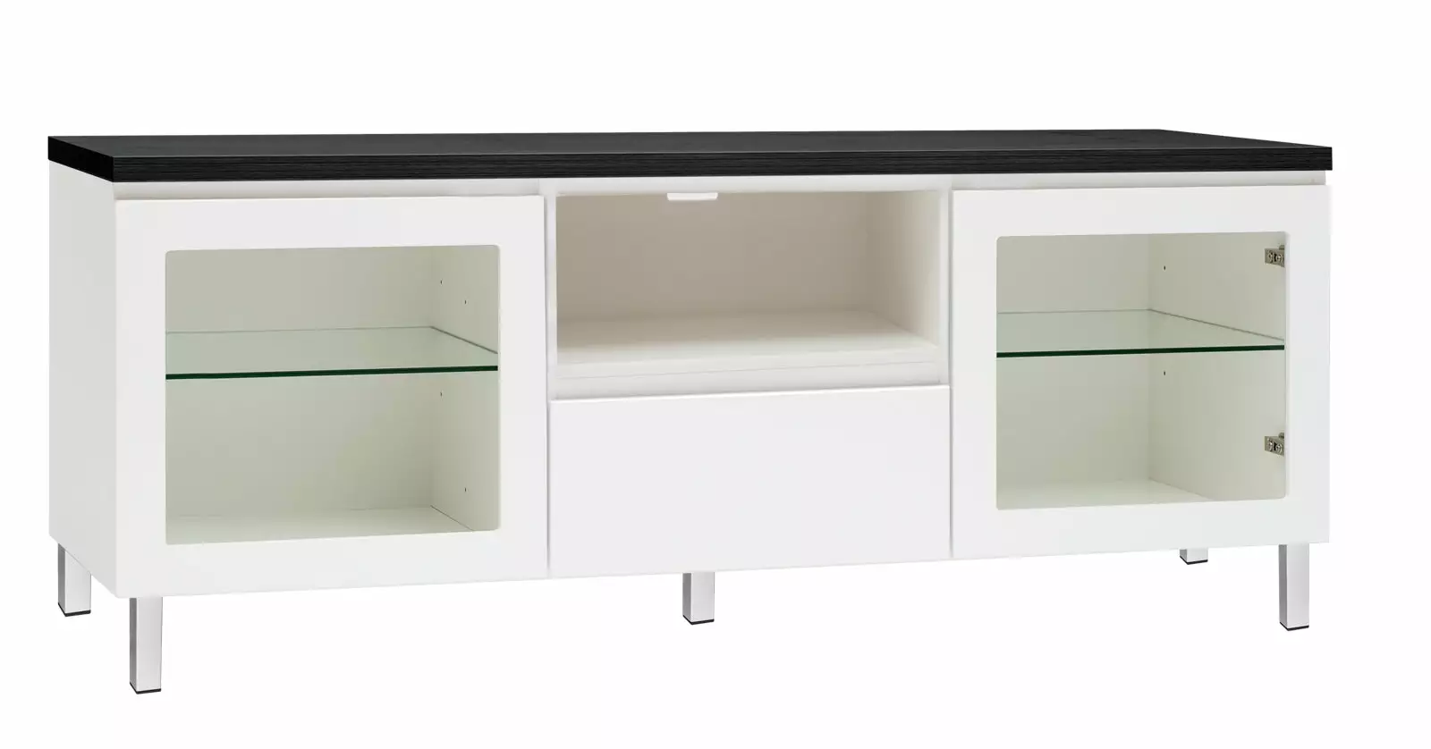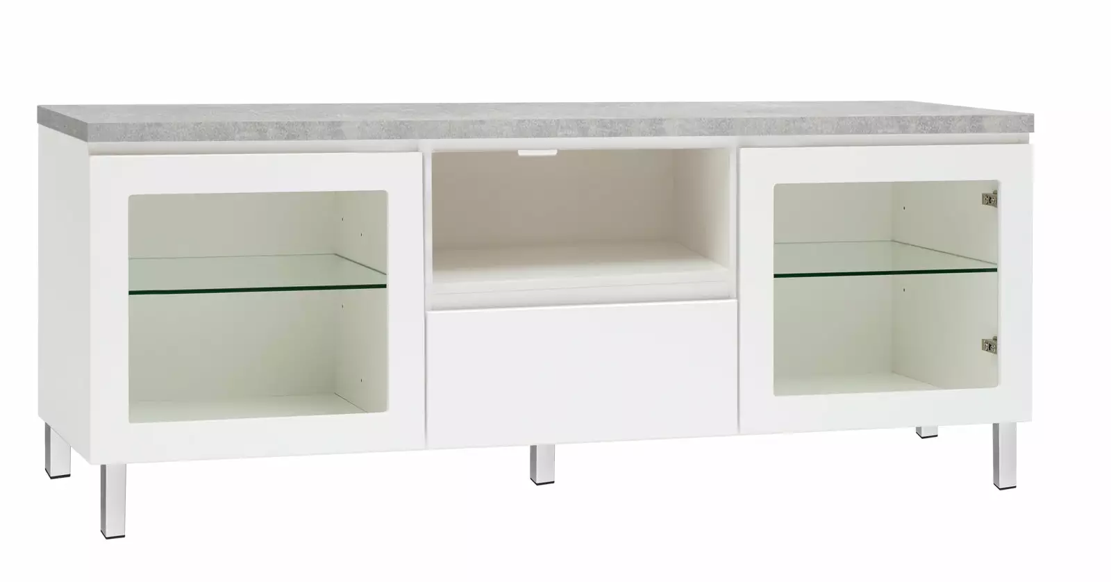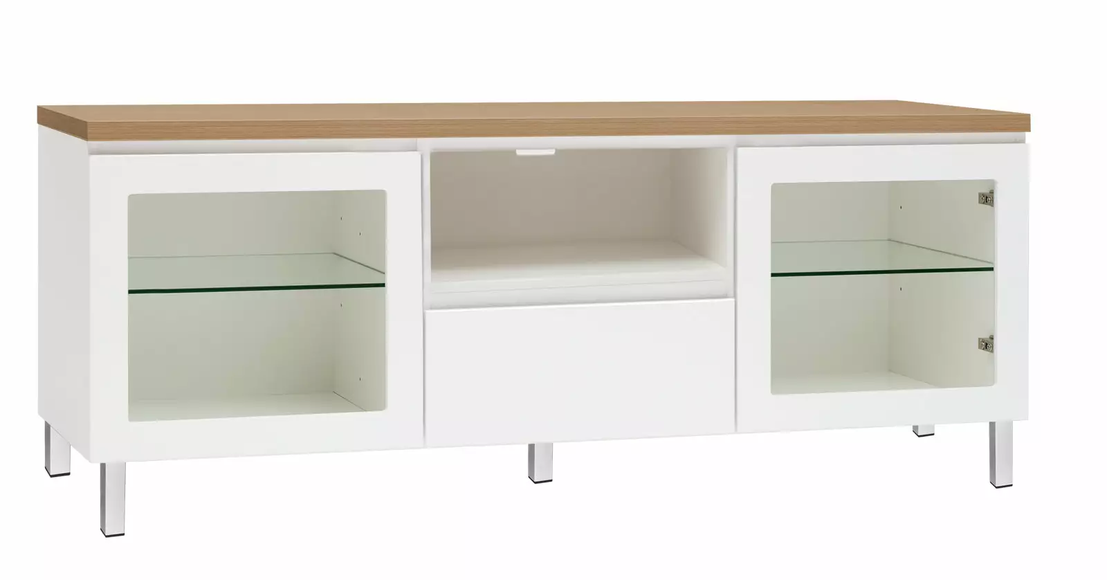 Käytännöllisessä Viiva-tv-tasossa on oikeanlaiset säilytystilat medialaitteille, läpiviennit johdoille sekä tietenkin sopivasti tilaa tv:lle ja mahdollisille lisäkaiuttimille. Tason sivuilla on lasiovikaapit ja keskellä avotilan alla laatikko. Voit valita tason joko 5,5 cm korkealla jalkasokkelilla tai 10 cm korkeilla jaloilla. Tv-tasoon on saatavana lisävarusteena myös valkoinen karkaistu lasikansi.