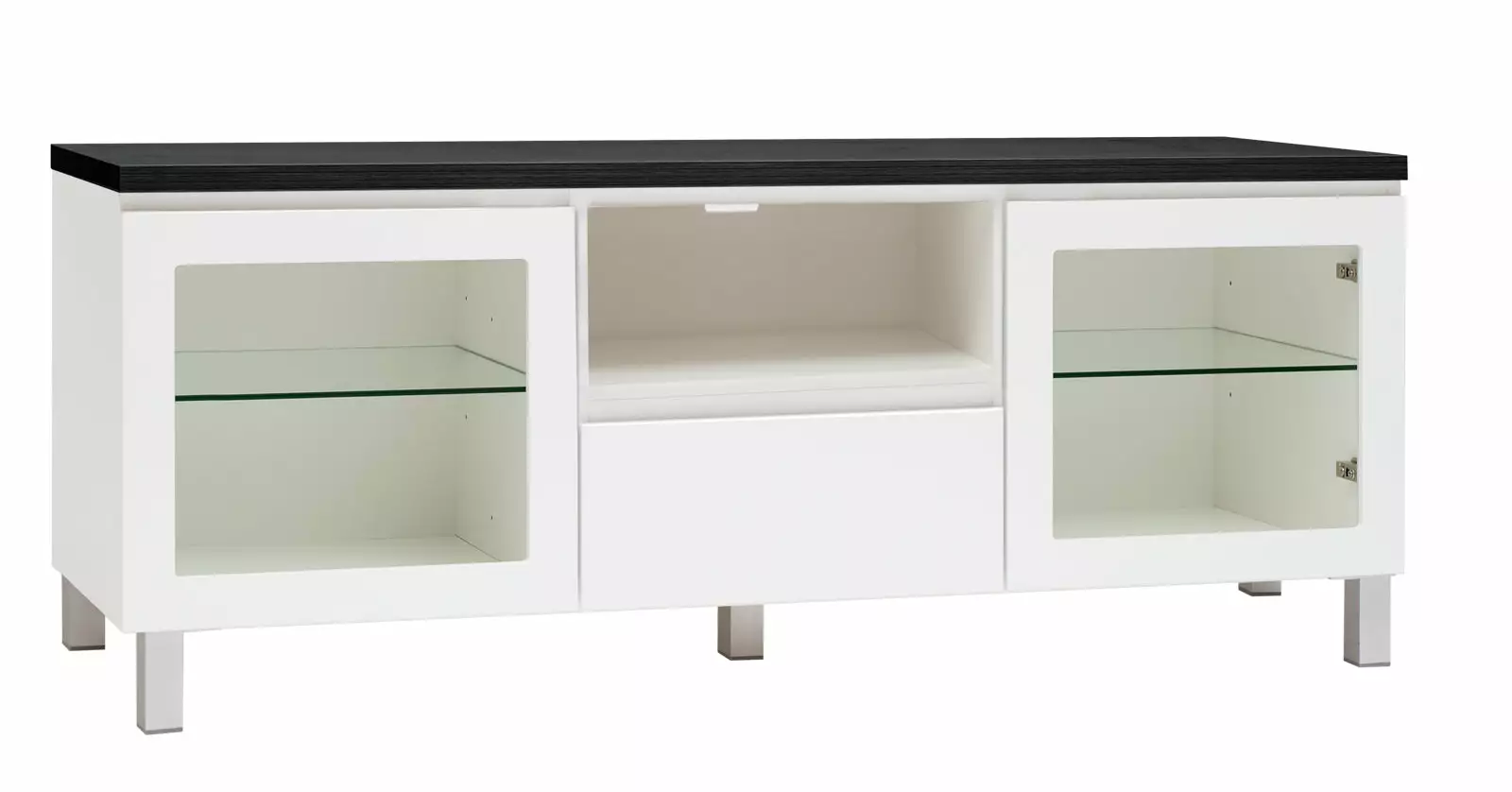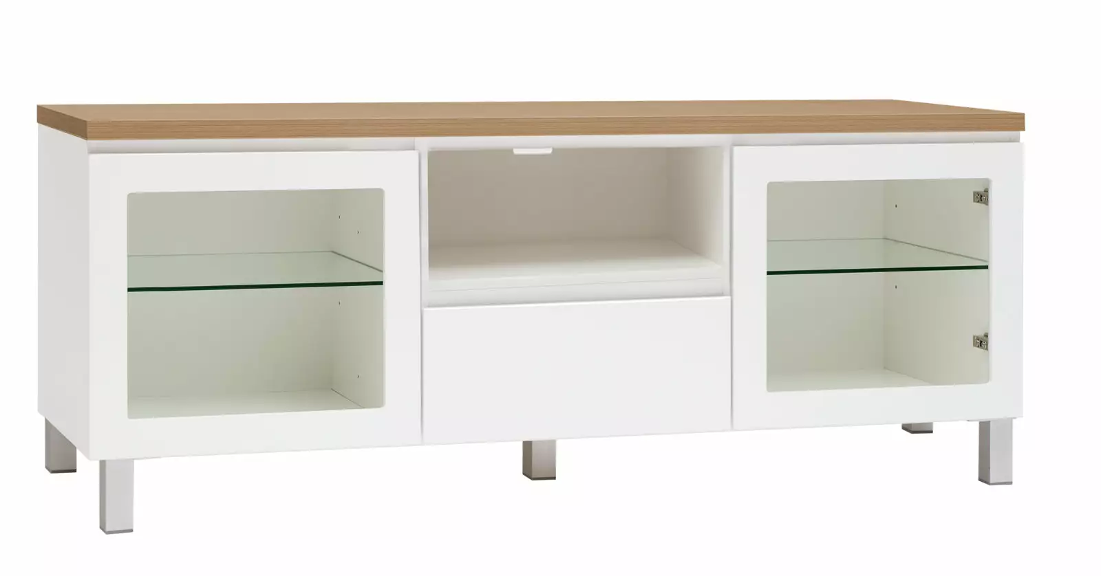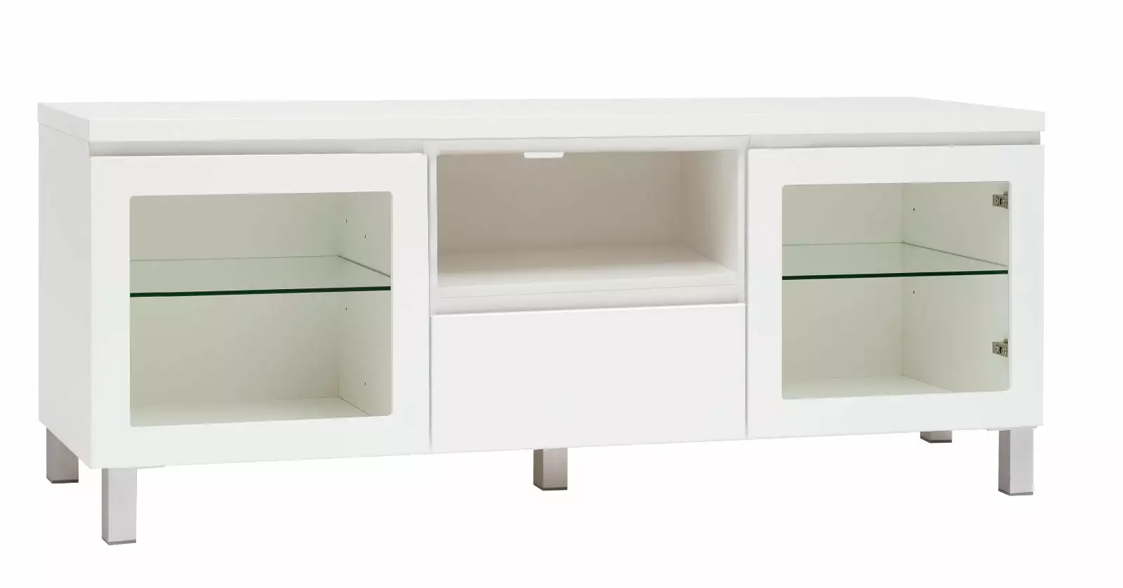 Käytännöllisessä Viiva-tv-tasossa on oikeanlaiset säilytystilat medialaitteille, läpiviennit johdoille sekä tietenkin sopivasti tilaa tv:lle ja mahdollisille lisäkaiuttimille. Tason sivuilla on lasiovikaapit ja keskellä avotilan alla laatikko. Voit valita tason joko 5,5 cm korkealla jalkasokkelilla tai 10 cm korkeilla jaloilla. Tv-tasoon on saatavana lisävarusteena myös valkoinen karkaistu lasikansi.