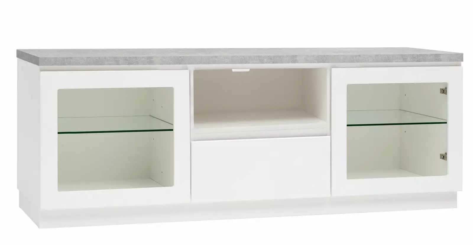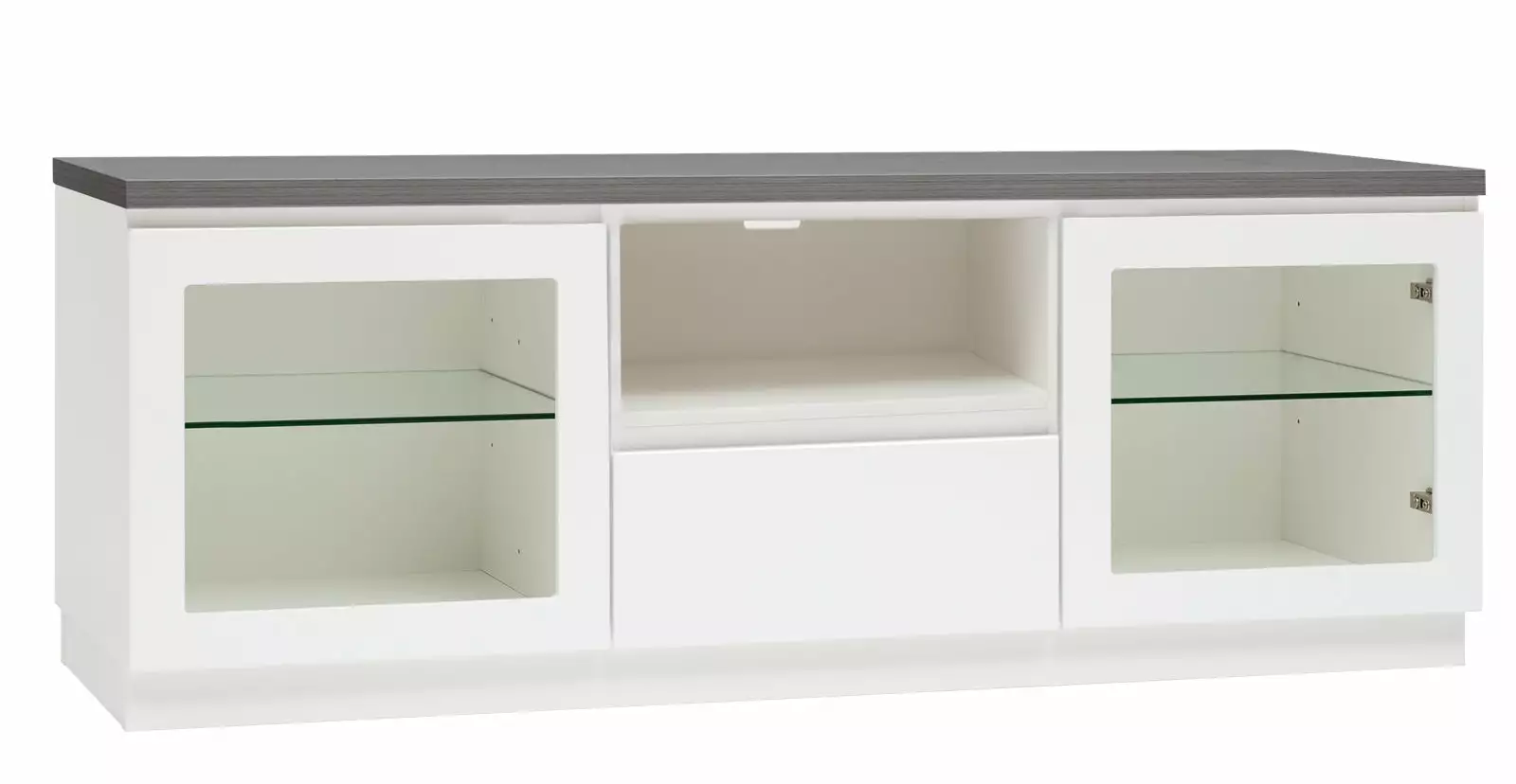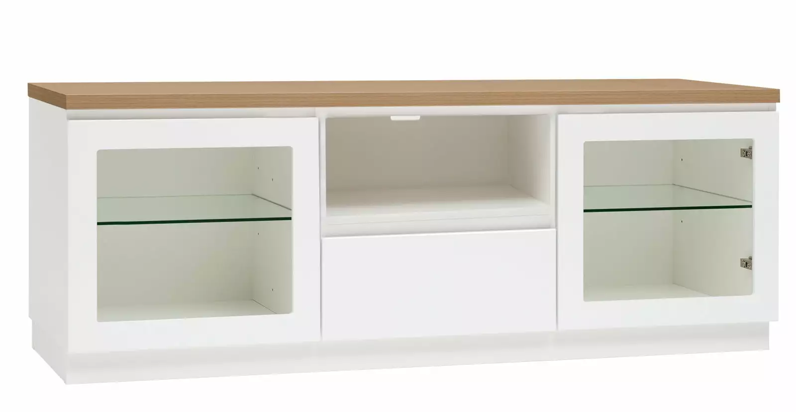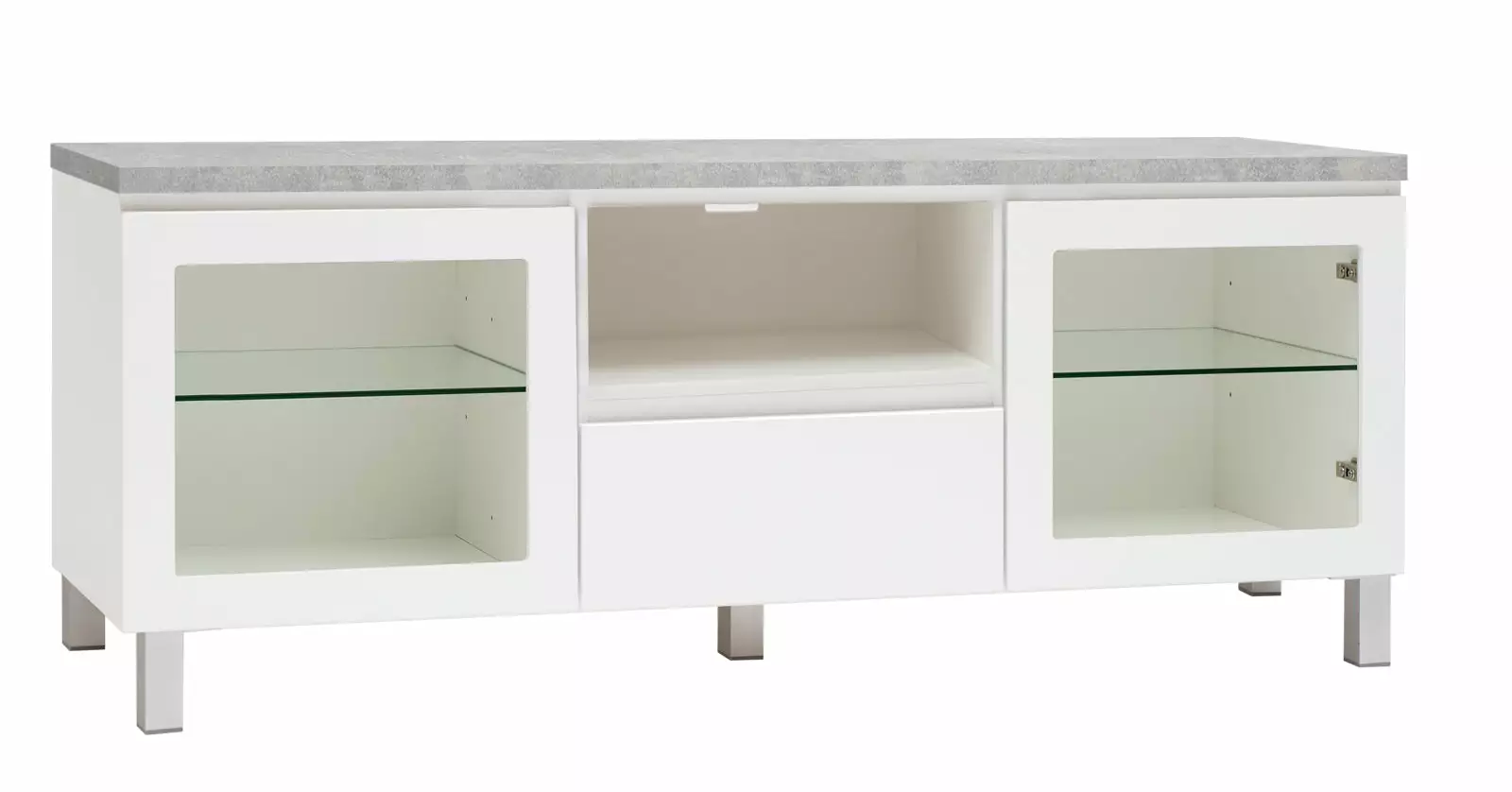 Käytännöllisessä Viiva-tv-tasossa on oikeanlaiset säilytystilat medialaitteille, läpiviennit johdoille sekä tietenkin sopivasti tilaa tv:lle ja mahdollisille lisäkaiuttimille. Tason sivuilla on lasiovikaapit ja keskellä avotilan alla laatikko. Voit valita tason joko 5,5 cm korkealla jalkasokkelilla tai 10 cm korkeilla jaloilla. Tv-tasoon on saatavana lisävarusteena myös valkoinen karkaistu lasikansi.