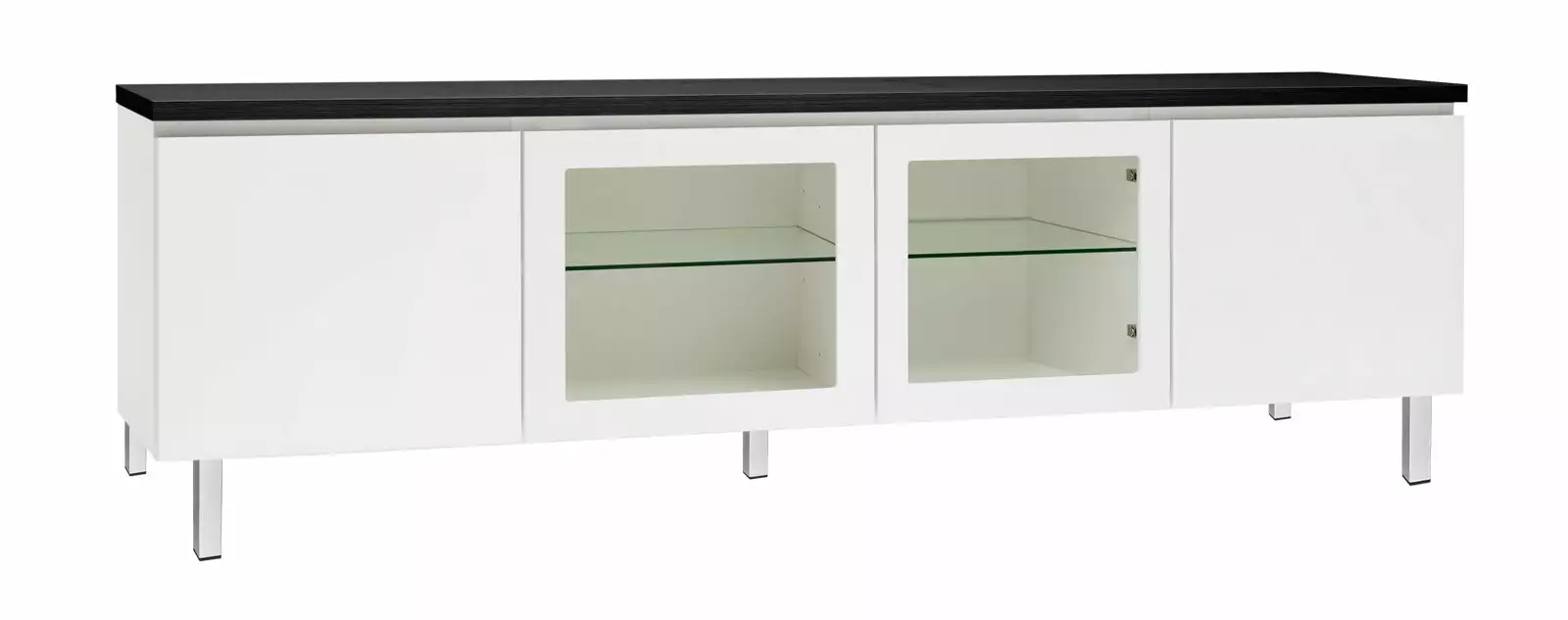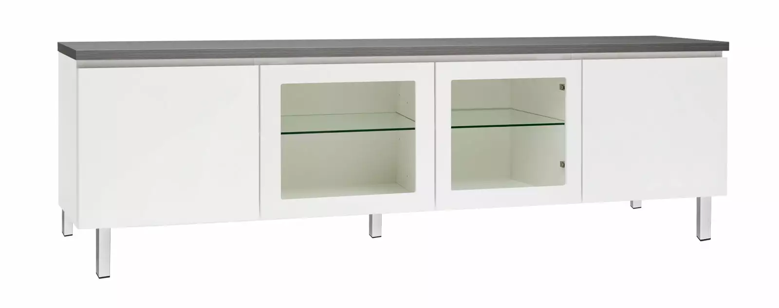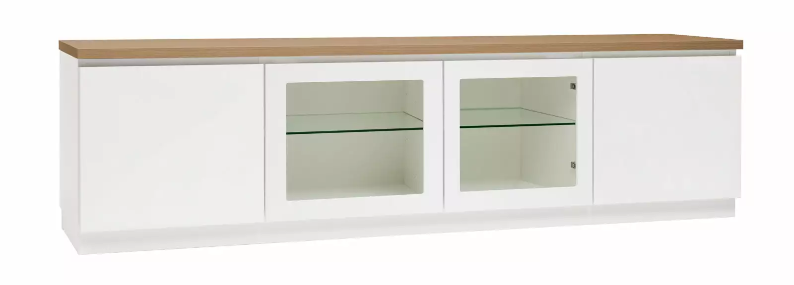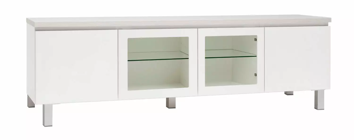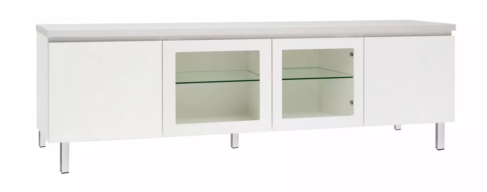 Käytännöllisessä leveässä Viiva-tv-tasossa on oikeanlaiset säilytystilat medialaitteille, läpiviennit johdoille sekä tietenkin sopivasti tilaa tv:lle ja mahdollisille lisäkaiuttimille. Tason sivuilla on ovikaapit ja keskellä kaksi lasiovikaappia. Voit valita tason joko 5,5 cm korkealla jalkasokkelilla tai 10 cm korkeilla jaloilla. Tv-tasoon on saatavana lisävarusteena myös valkoinen karkaistu lasikansi.