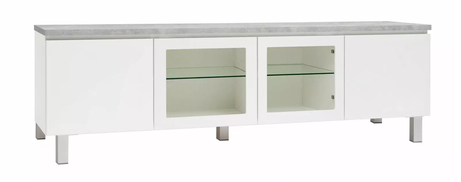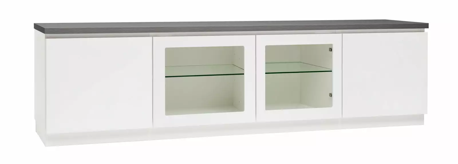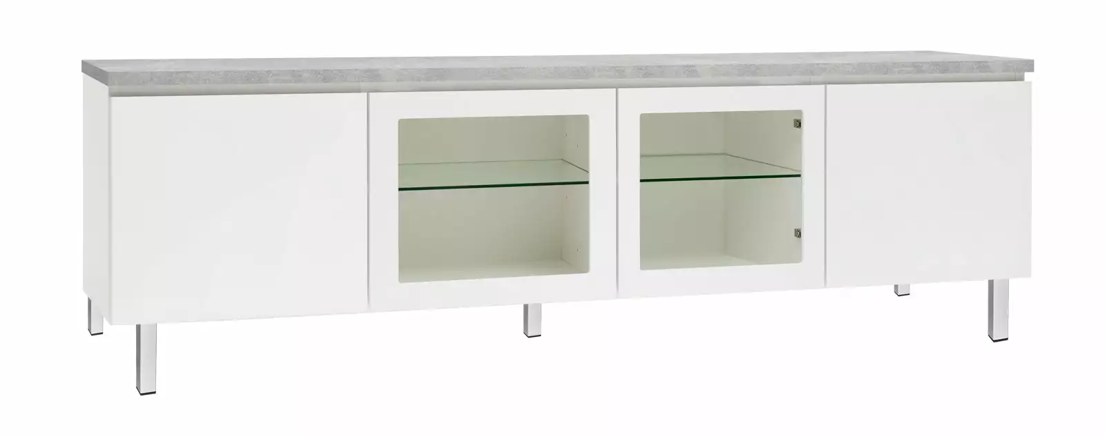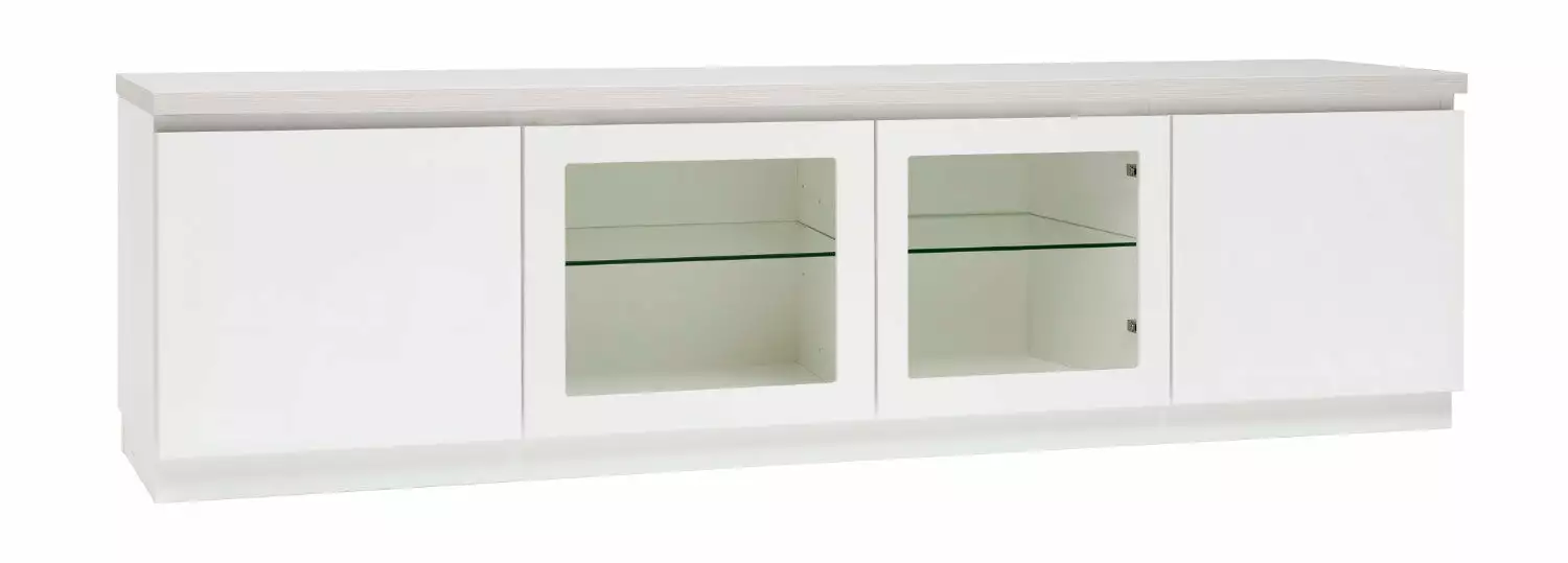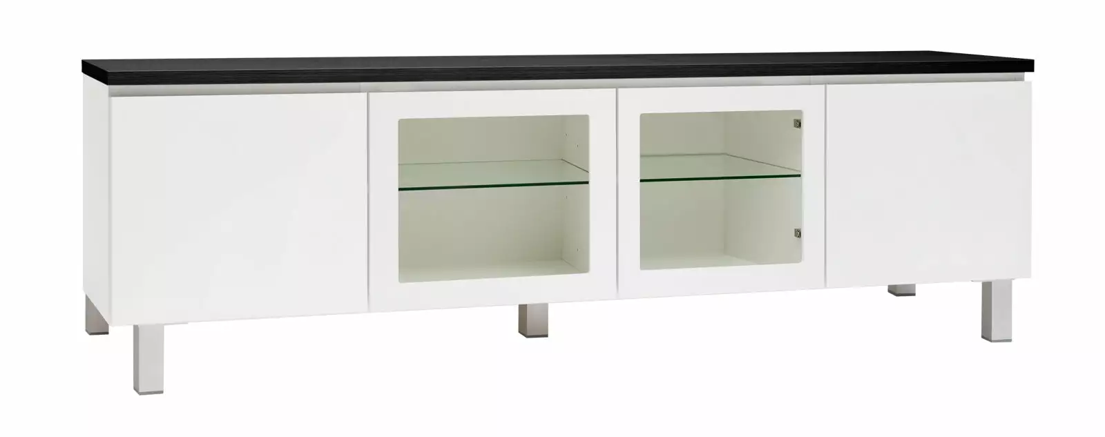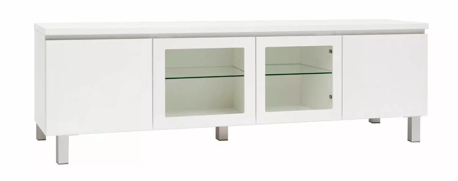 Käytännöllisessä leveässä Viiva-tv-tasossa on oikeanlaiset säilytystilat medialaitteille, läpiviennit johdoille sekä tietenkin sopivasti tilaa tv:lle ja mahdollisille lisäkaiuttimille. Tason sivuilla on ovikaapit ja keskellä kaksi lasiovikaappia. Voit valita tason joko 5,5 cm korkealla jalkasokkelilla tai 10 cm korkeilla jaloilla. Tv-tasoon on saatavana lisävarusteena myös valkoinen karkaistu lasikansi.