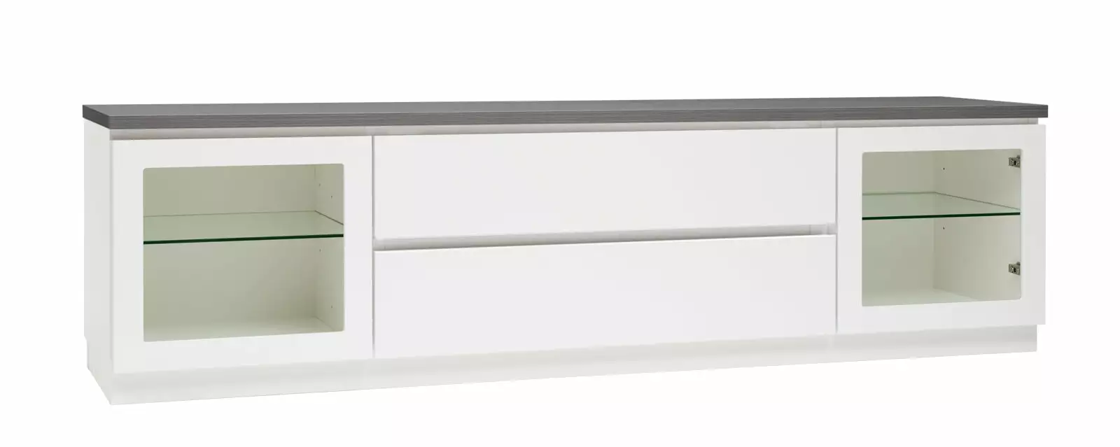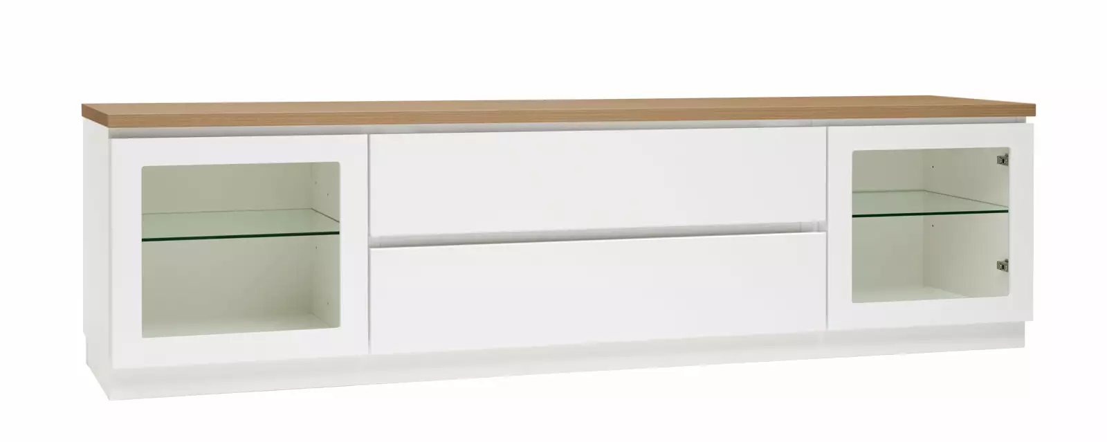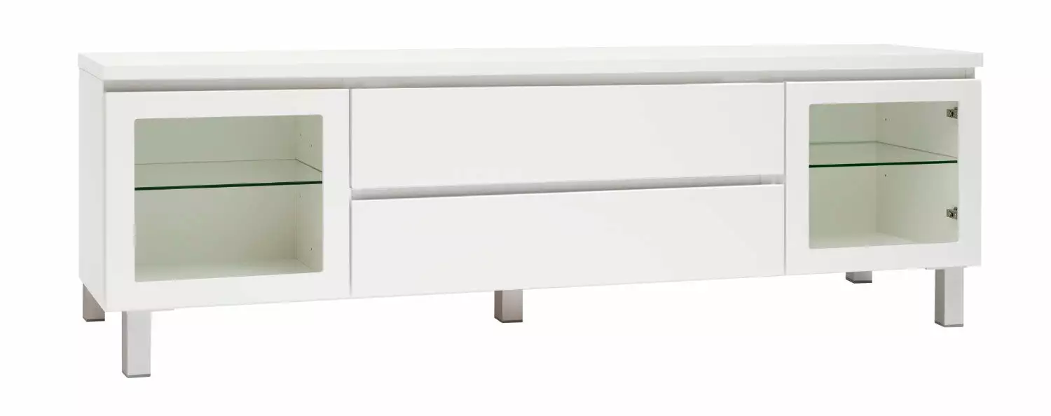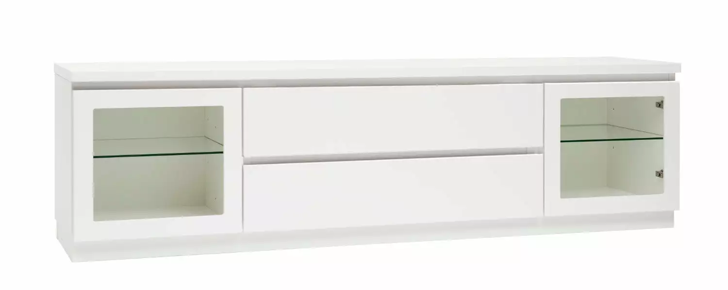 Käytännöllisessä leveässä Viiva-tv-tasossa on oikeanlaiset säilytystilat medialaitteille, läpiviennit johdoille sekä tietenkin sopivasti tilaa tv:lle ja mahdollisille lisäkaiuttimille. Tason sivuilla on lasiovikaapit ja keskellä kaksi laatikkoa. Voit valita tason joko 5,5 cm korkealla jalkasokkelilla tai 10 cm korkeilla jaloilla. Tv-tasoon on saatavana lisävarusteena myös valkoinen karkaistu lasikansi.