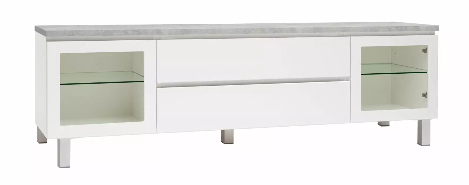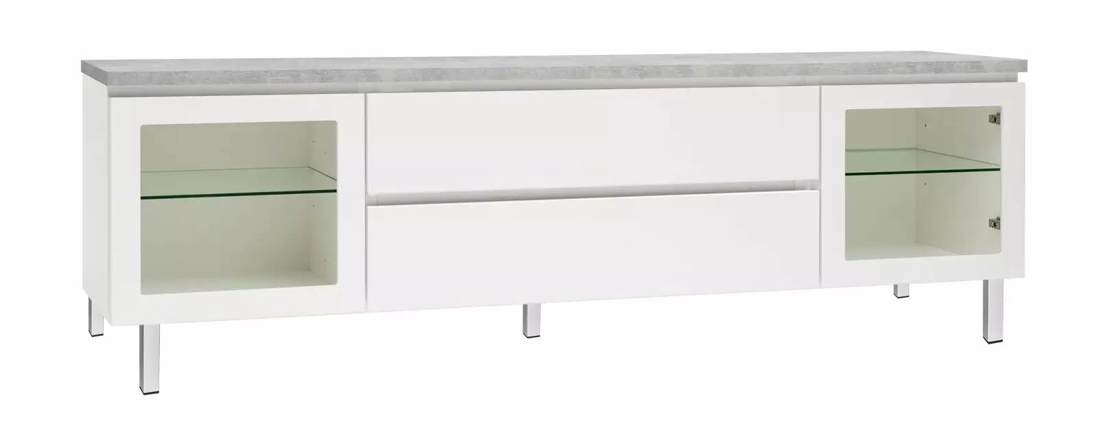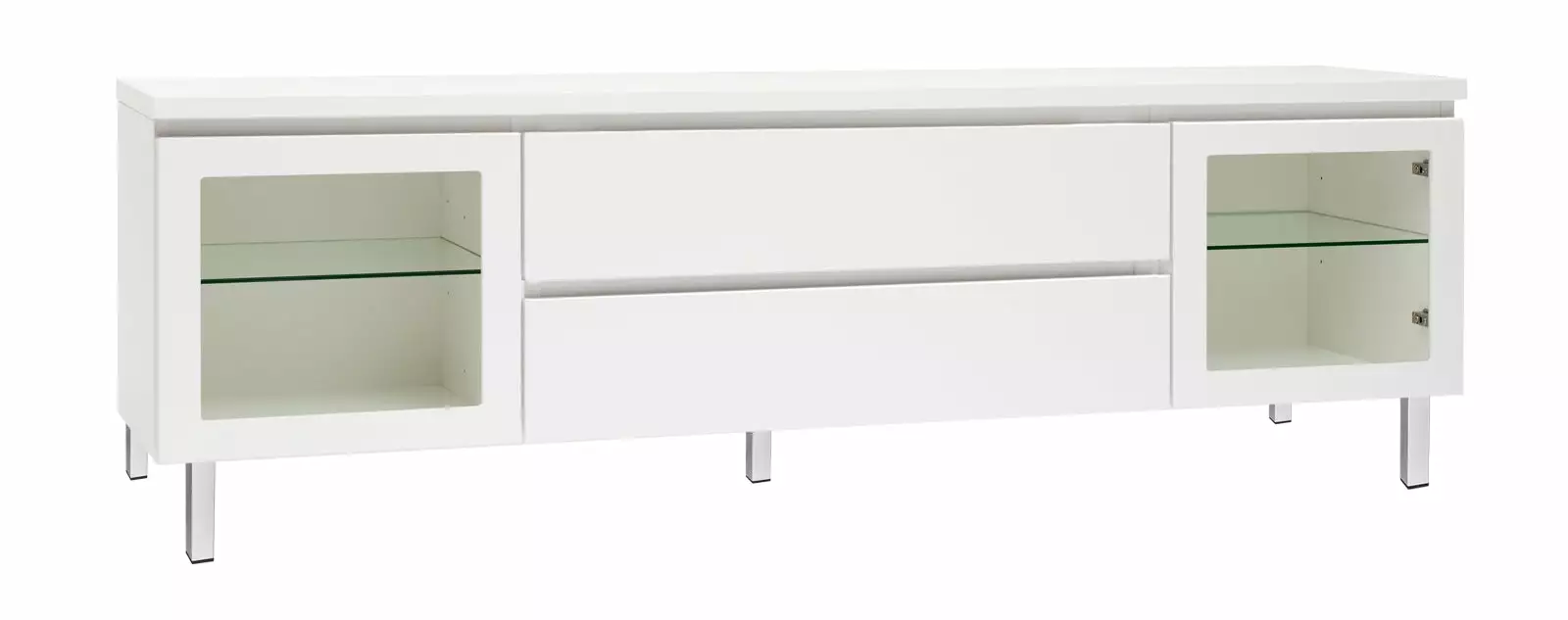 Käytännöllisessä leveässä Viiva-tv-tasossa on oikeanlaiset säilytystilat medialaitteille, läpiviennit johdoille sekä tietenkin sopivasti tilaa tv:lle ja mahdollisille lisäkaiuttimille. Tason sivuilla on lasiovikaapit ja keskellä kaksi laatikkoa. Voit valita tason joko 5,5 cm korkealla jalkasokkelilla tai 10 cm korkeilla jaloilla. Tv-tasoon on saatavana lisävarusteena myös valkoinen karkaistu lasikansi.