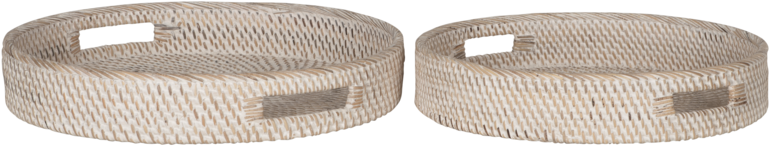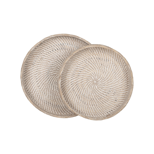 Rottinkitarjotin 2 tarjottimen settinä. Rottingista punotut ja raikkaasti valkoisella lakatut pyöreät tarjottimet tyylikkääseen tarjoiluun. Kaksi tarjotinta, joiden koot: