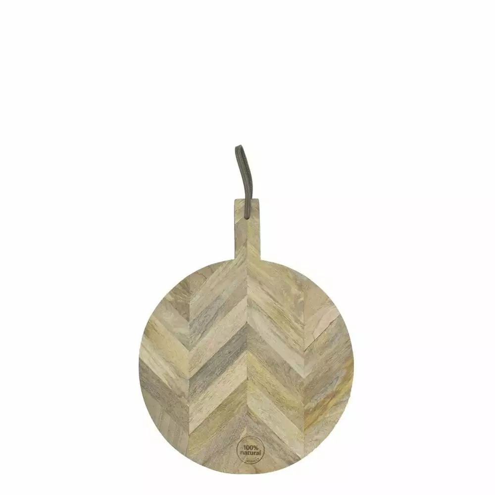 Leikkuulautoja ei voi olla liikaa! Tämä pyöreä leikkuulauta kalanruotokuviolla sopii niin tarjoiluun, ruuan käsittelyyn kuin keittiön kaunistukseksikin. Trendikäs kalanruotokuviointi vain kaunistuu käytössä, joten älä jätä leikkuulautaa seinälle, vaan leikkaa sillä leivät, ja tarjoile juustot tai vaikka tapakset.
