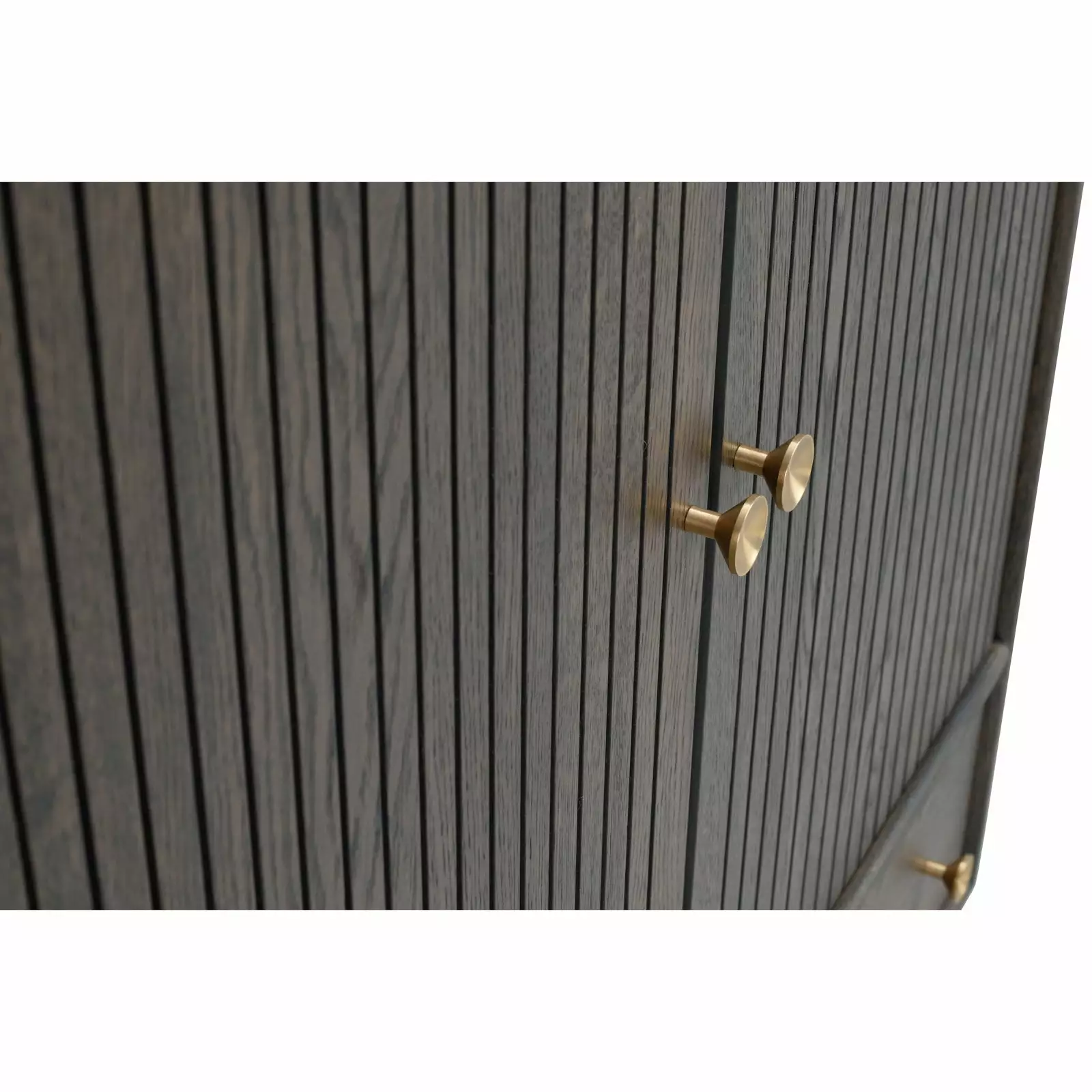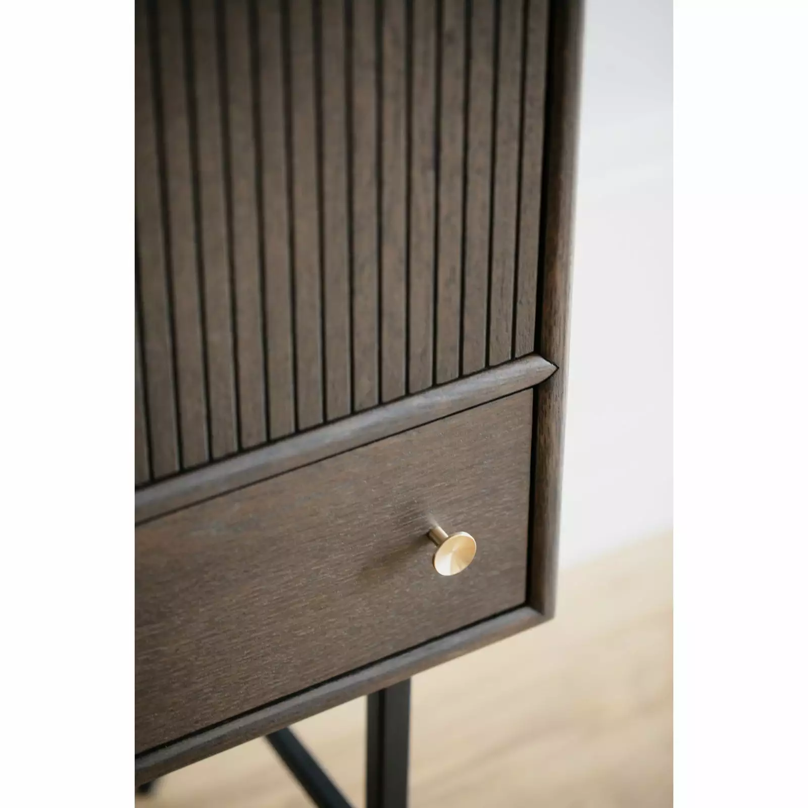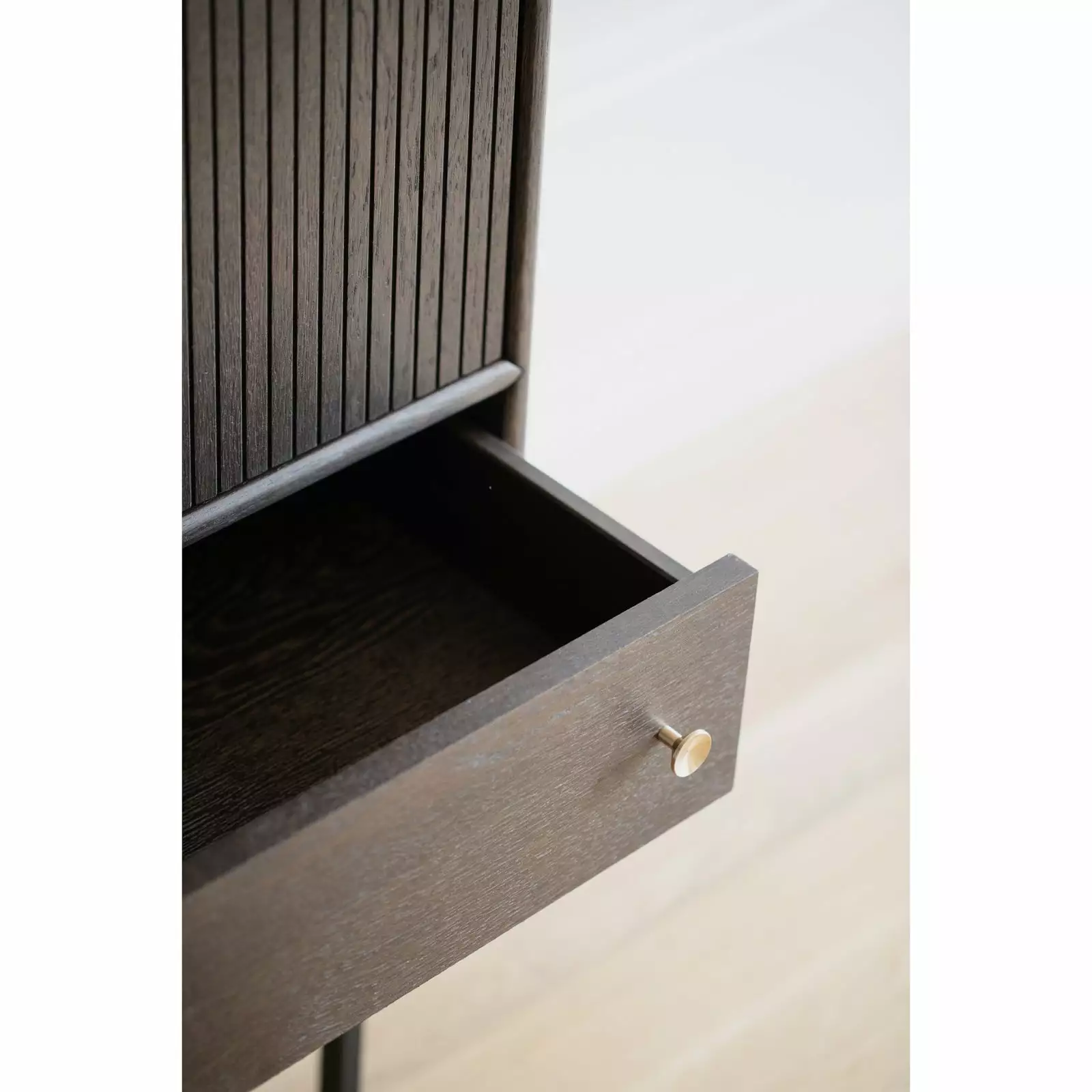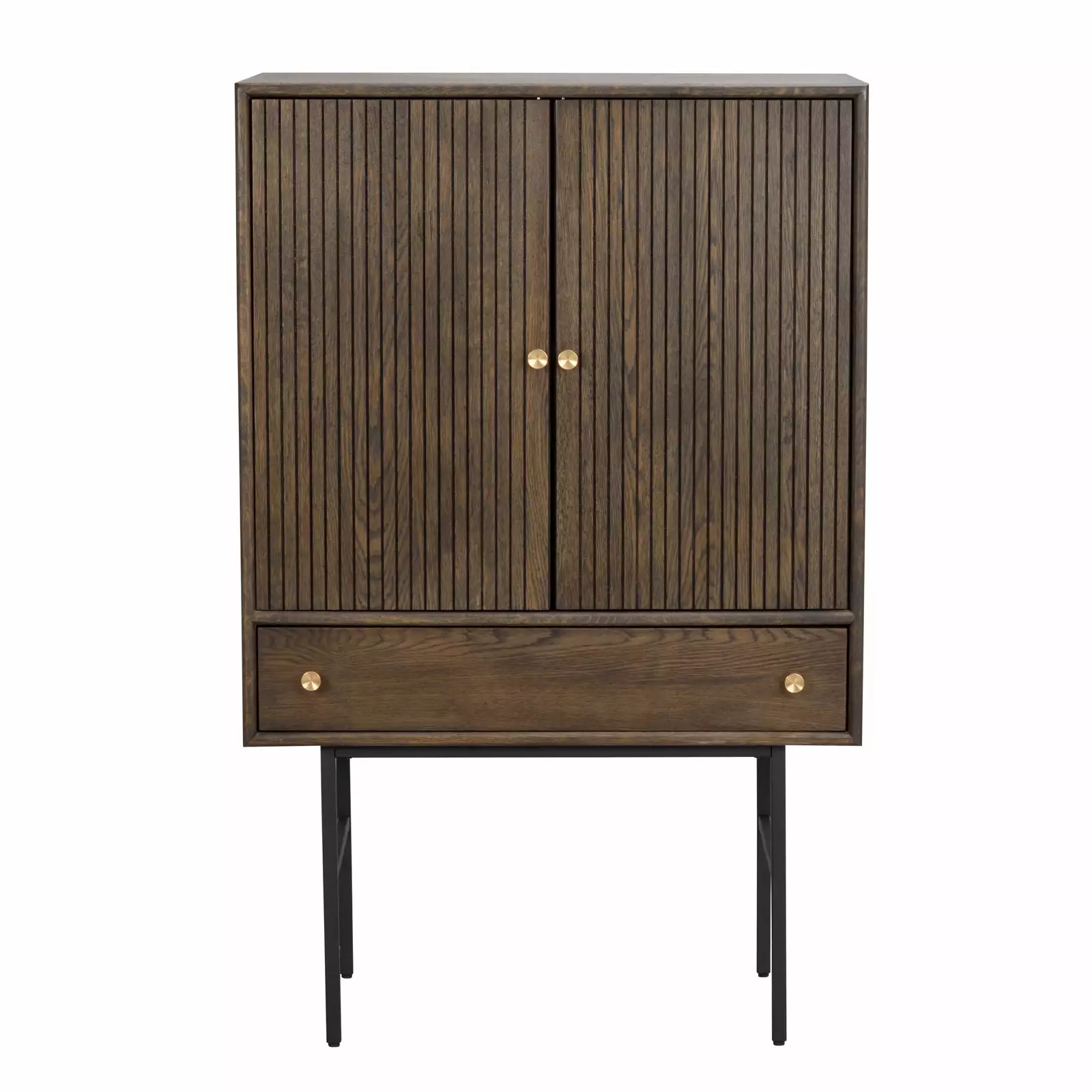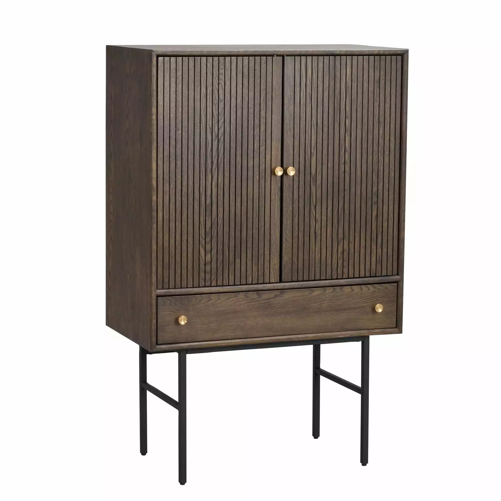 Tyylikäs Clearbrook-kaappi on suoralinjainen säilytyskokonaisuus, jonka uritetut ovet ja messingin väriset vetimet toimivat kauniina katseen vangitsijoina. Kaappi on ruskeaksi petsattua tammiviilua ja sen ohuet mustat jalat tuovat muuten jykevän säilytyskalusteen ilmeeseen keveyttä. Kaapissa on runsaasti säilytystilaa ja säilytystilan korkeutta voi säätää liikuteltavilla hyllytasoilla. Kaapin ovet ja laatikot sulkeutuvat pehmeästi Soft Close -mekanismin ansiosta ja lisäävät käyttömukavuutta.