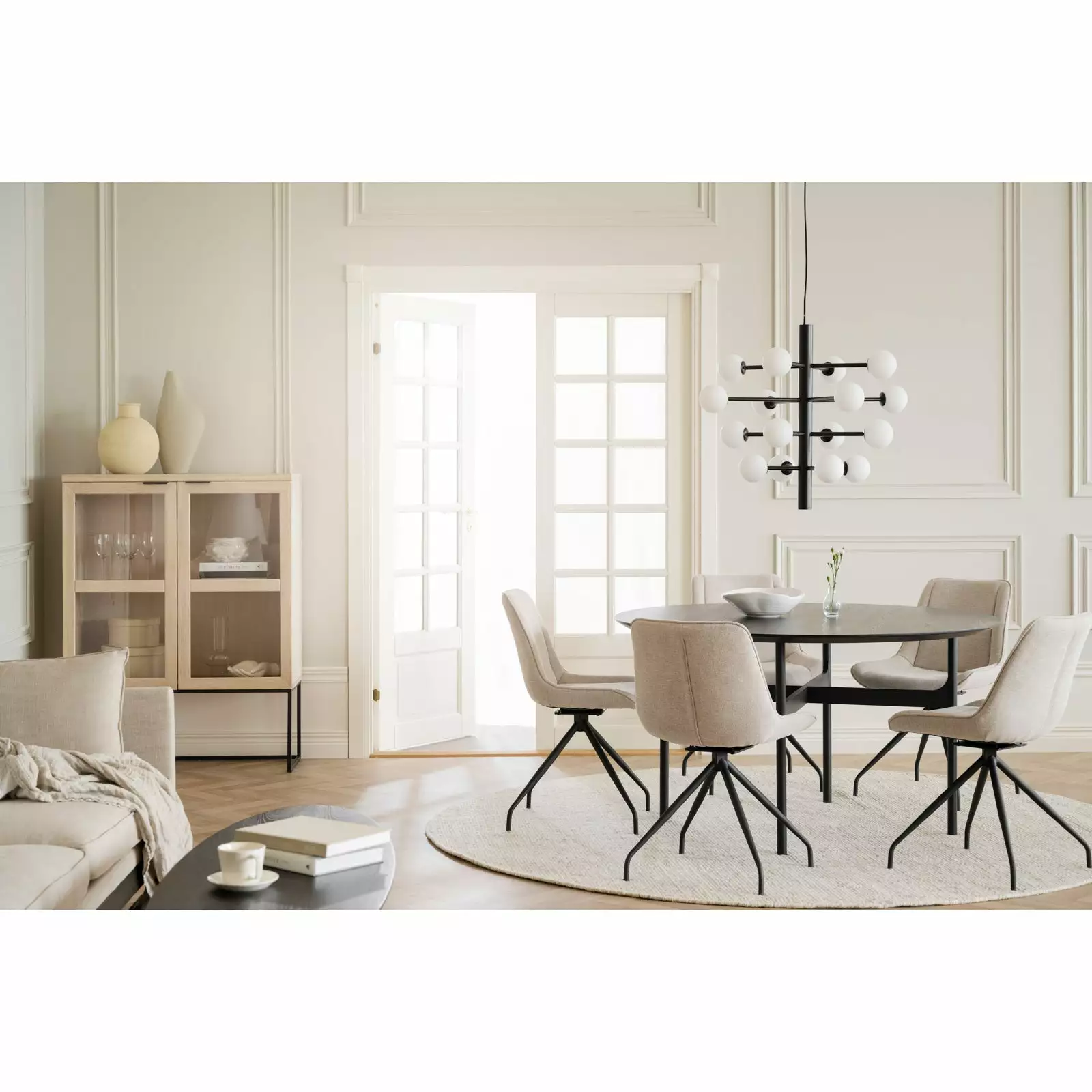 Colton-ruokapöydässä on musta viilutettu pöytälevy, joka tekee pöydän pinnasta eläväisen. Pöydän mustat metallijalat viimeistelevät tyylikkään kokonaisuuden. Ruokapöydän halkaisija on 135 cm, joten pöydän ääreen mahtuu helposti useampikin ruokailija.