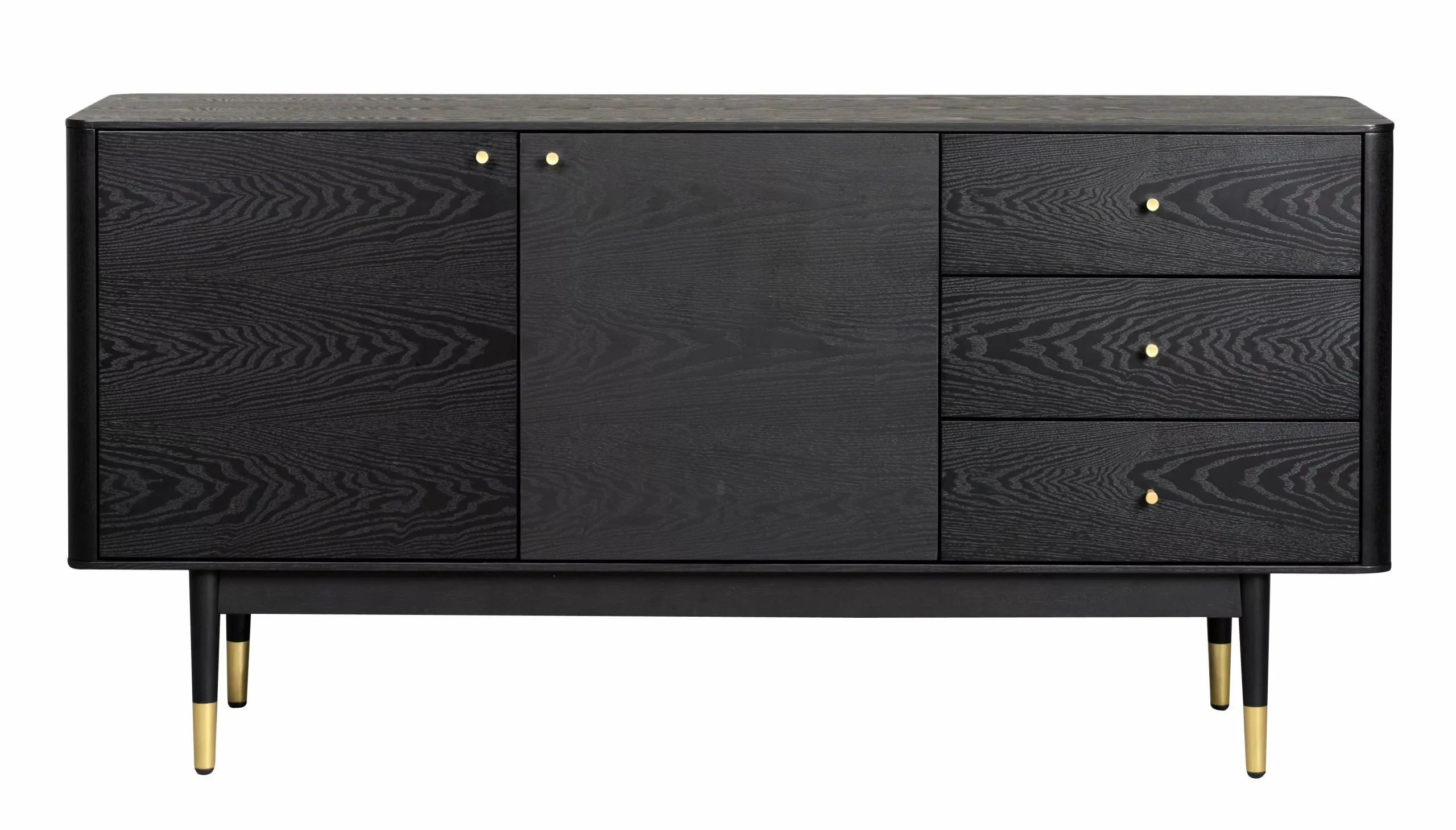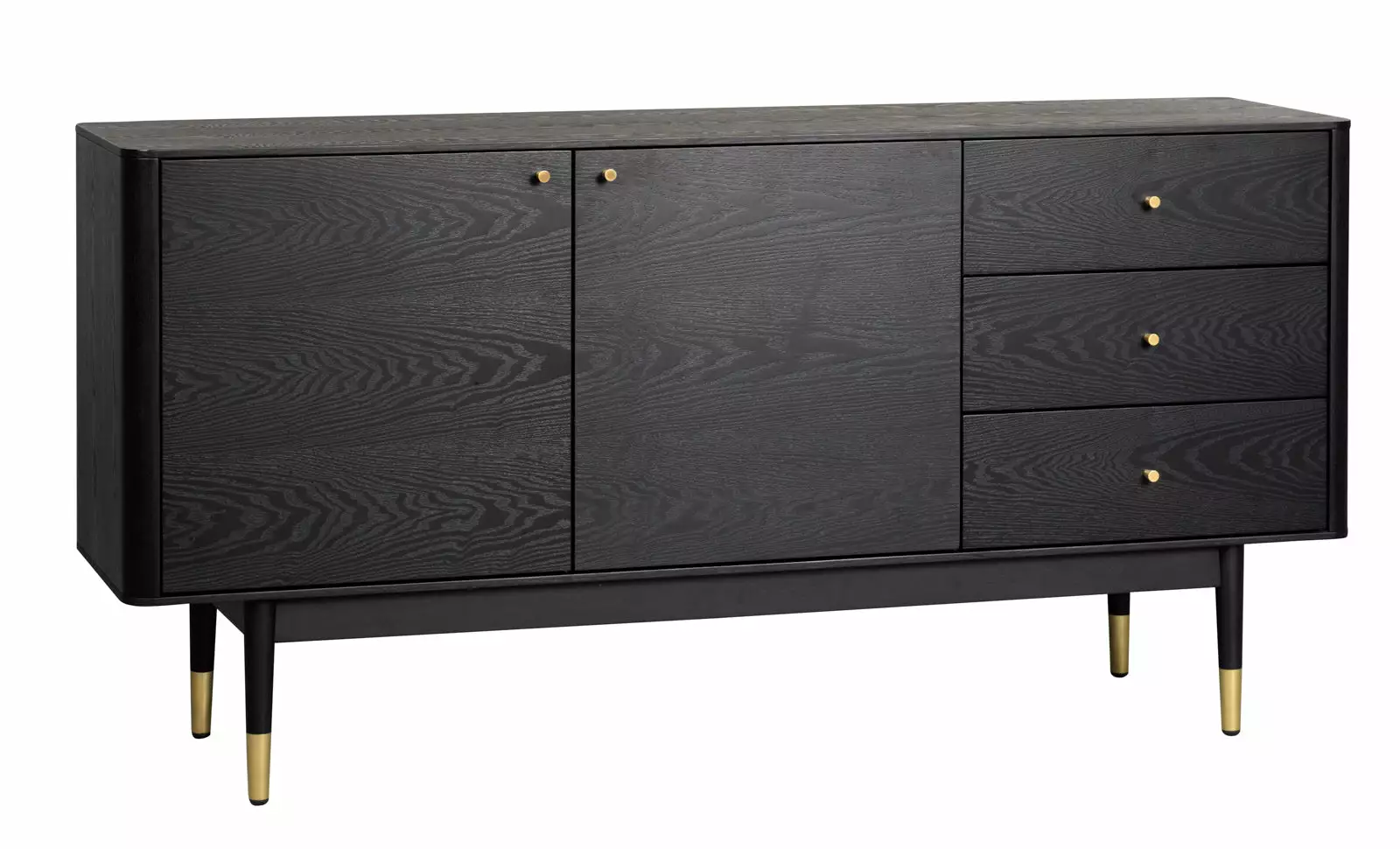 Kestävänä sivutasona toimivassa säilytysratkaisussa on ovellista kaapitilaa kahden oven takana, ja lisäksi kolme vetolaatikkoa kullanvärisillä metallisilla vetimillä. Hitaasti sulkeutuvat Soft Close -mekanismit ovissa ja lipasto-osan laatikoiden etulevyissä tuovat mukanaan säilytyskalusteen käytön mukavuuden.