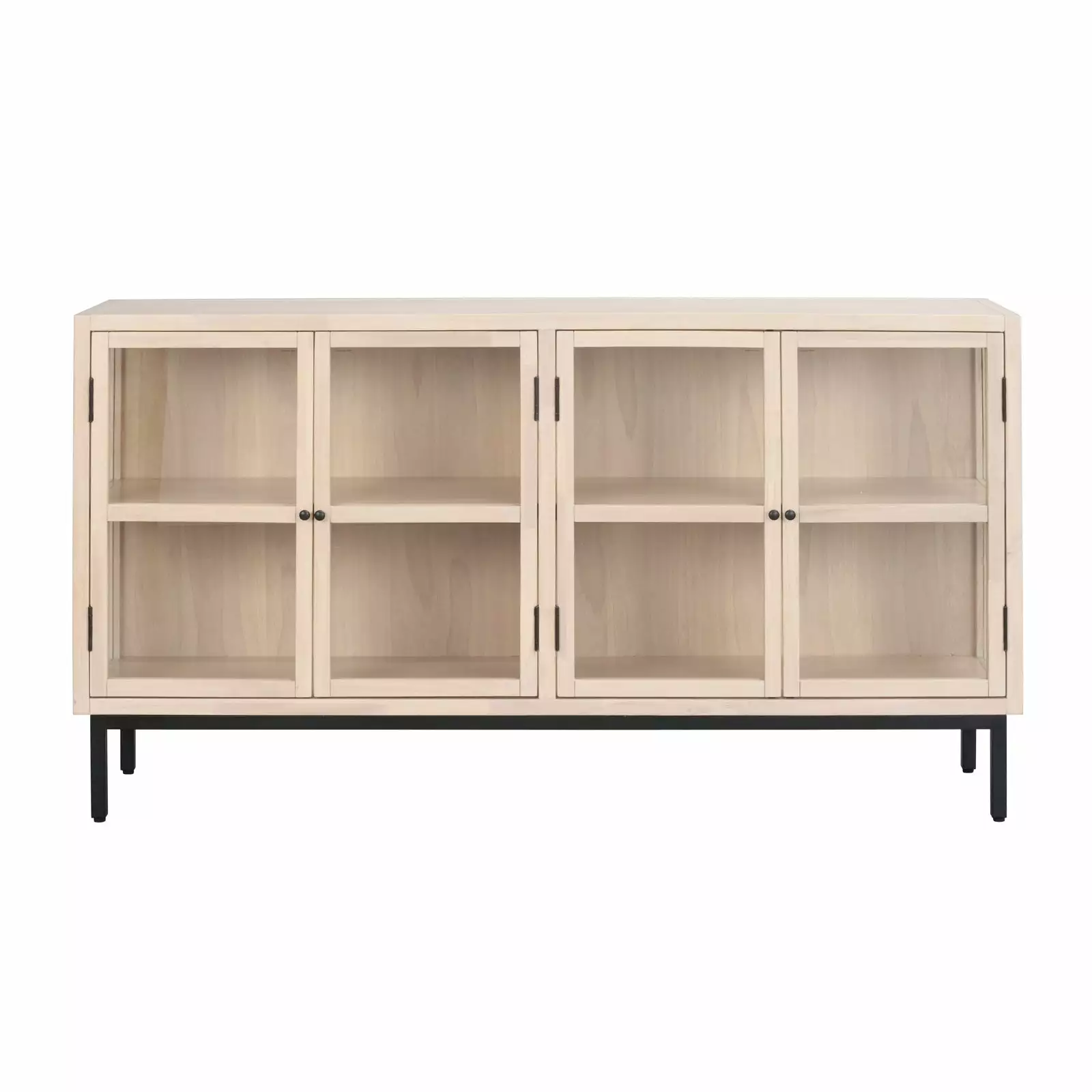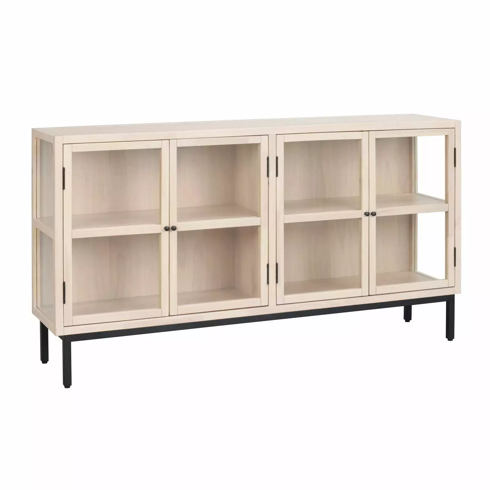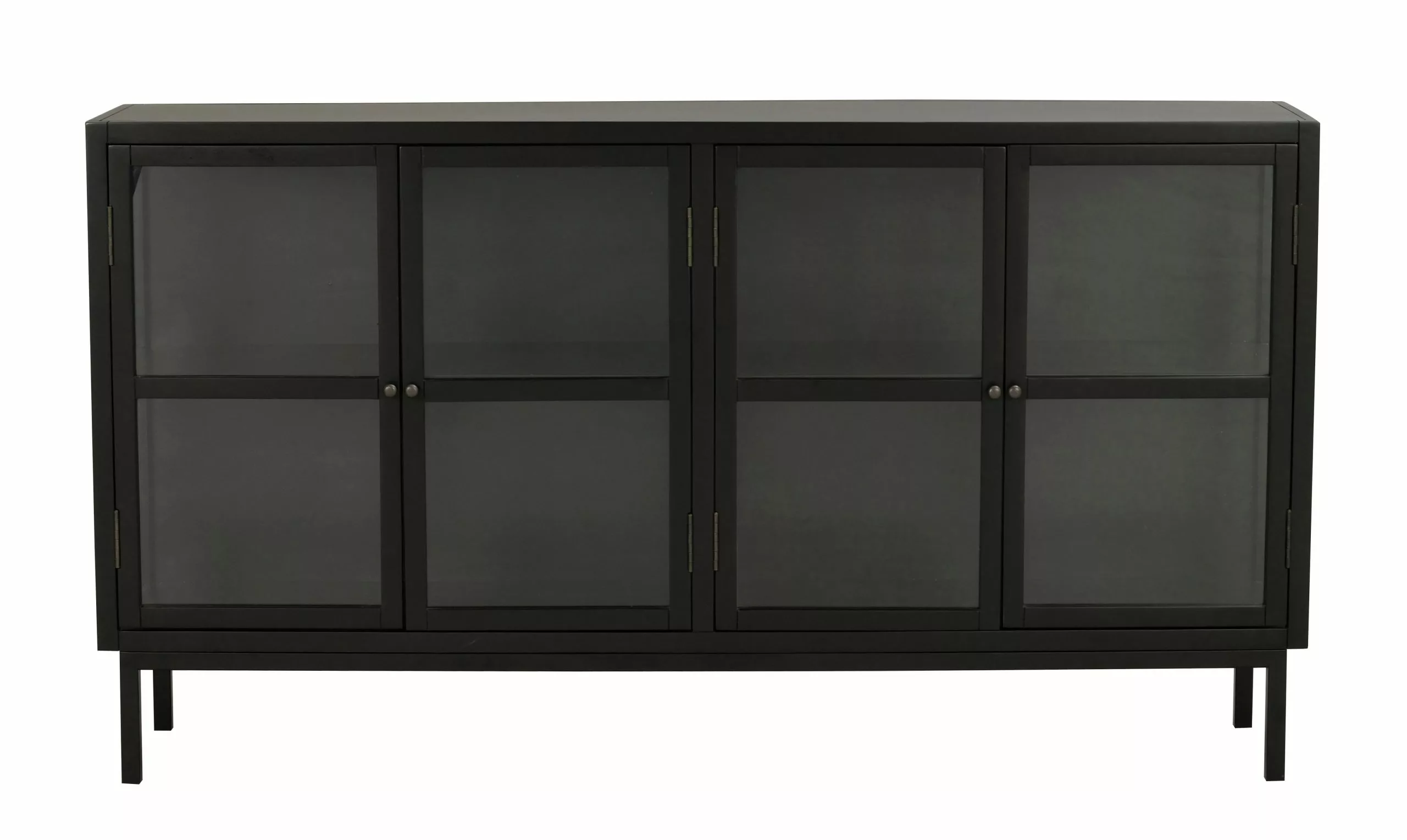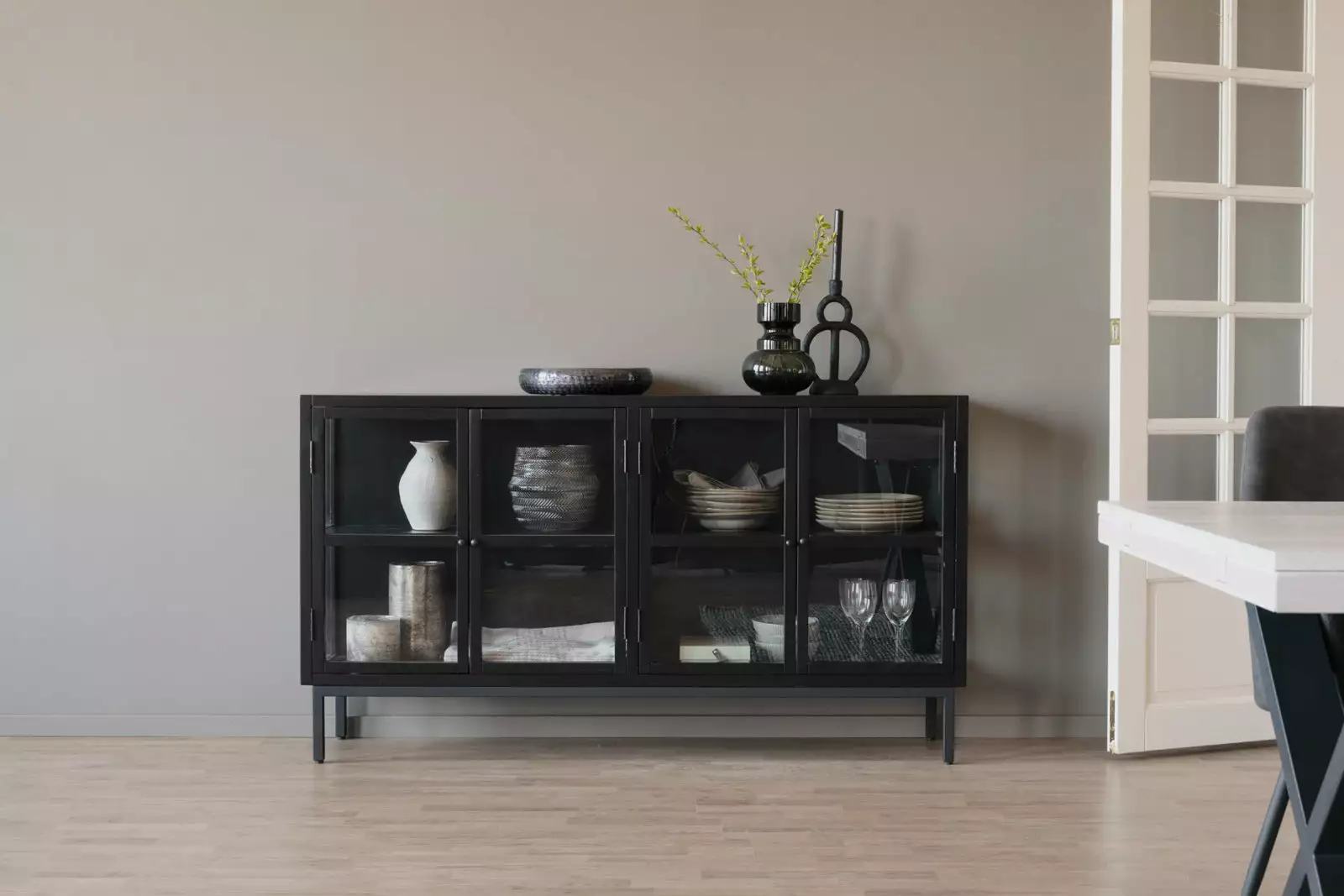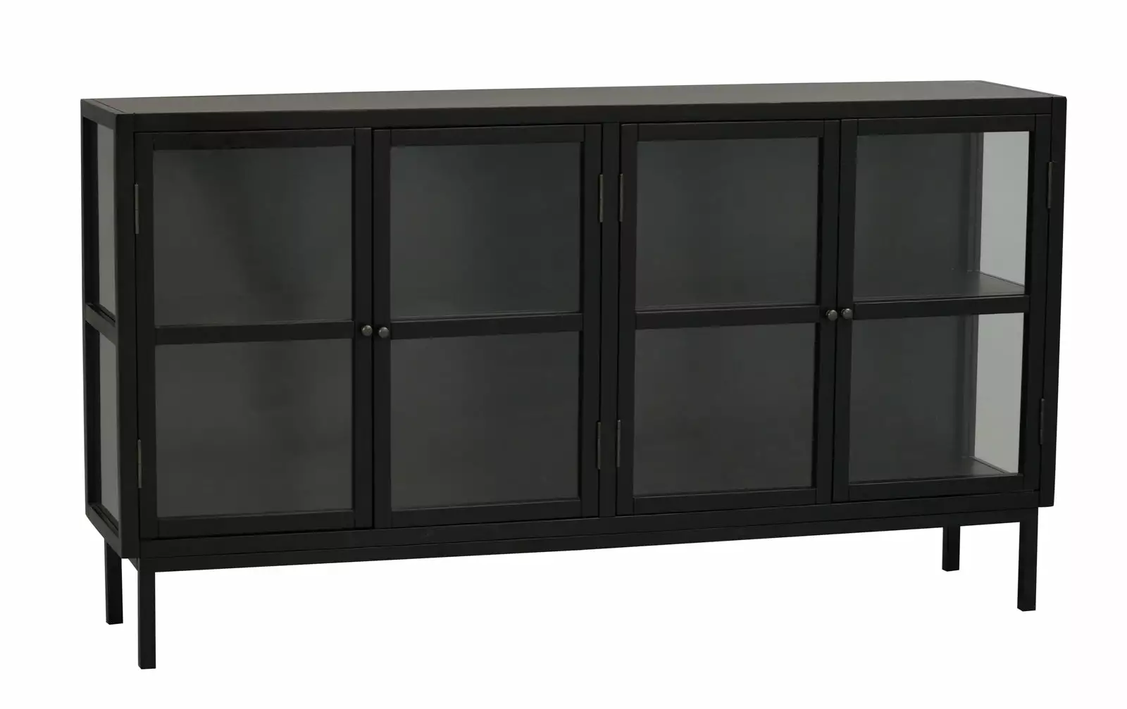 Marshalle-sarjan matala vitriinikaappi on tyylikäs säilytysratkaisu lasiovilla. Suoralinjainen kaappi on valmistettu lakatusta sileäpintaisesta puusta ja siinä on mustat jauhemaalatut metallijalat. Ohuet jalat keventävät näyttävän kalusteen ilmettä.